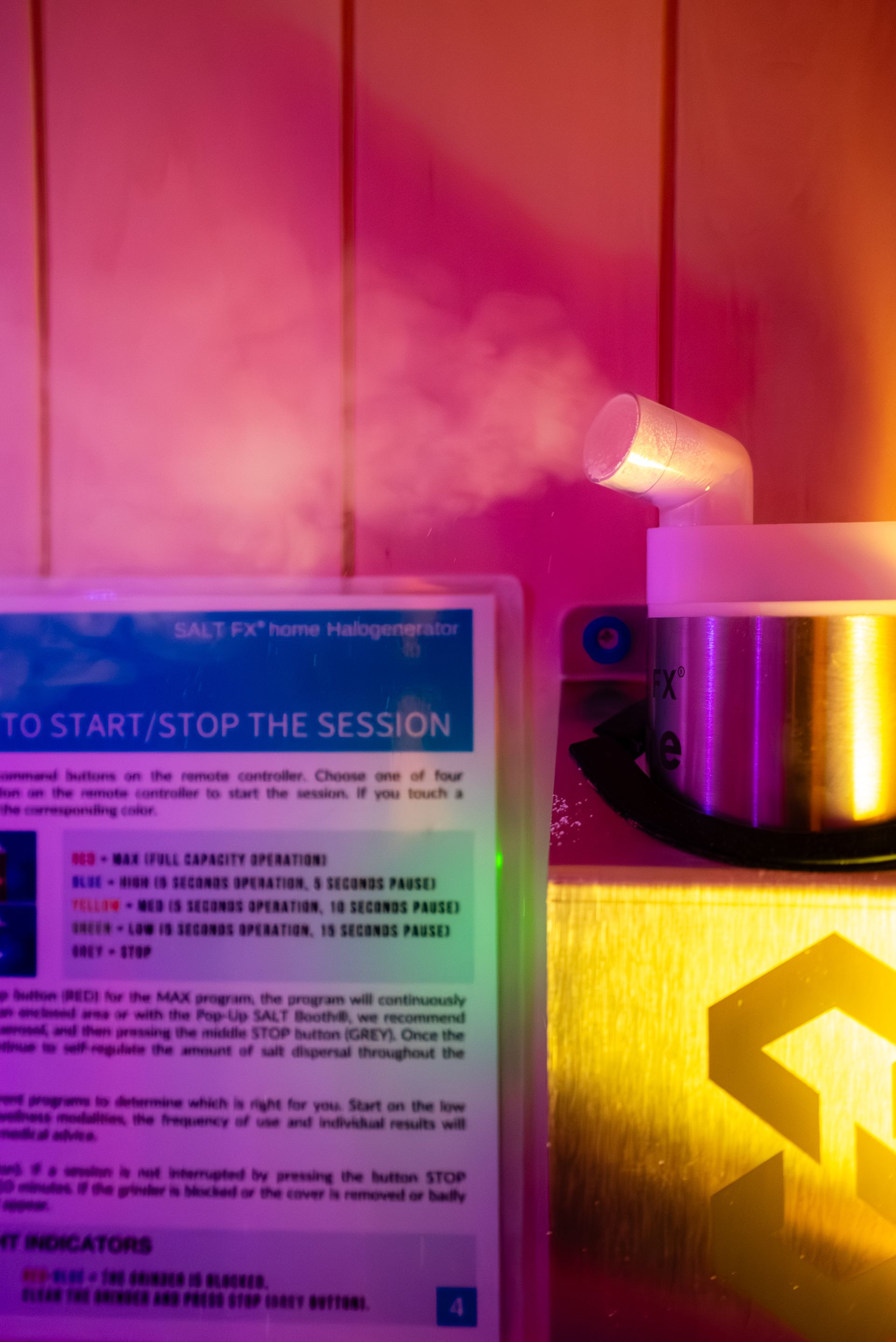 Dry salt therapy, also known as halotherapy, involves the use of 99.99% pure-grade sodium chloride (salt). The salt is heated, ground, and crushed into tiny microparticles. These dry aerosol microparticles are then dispersed into our specially designed saunas for salt therapy.